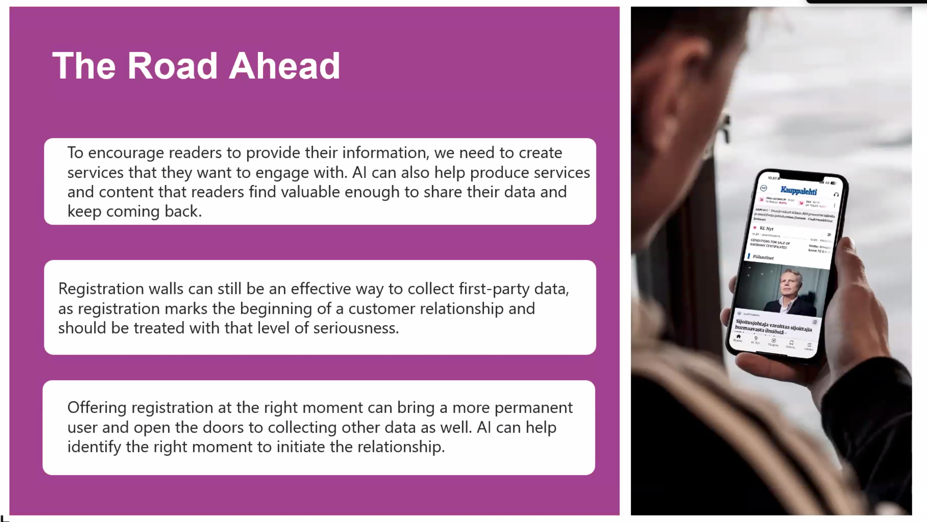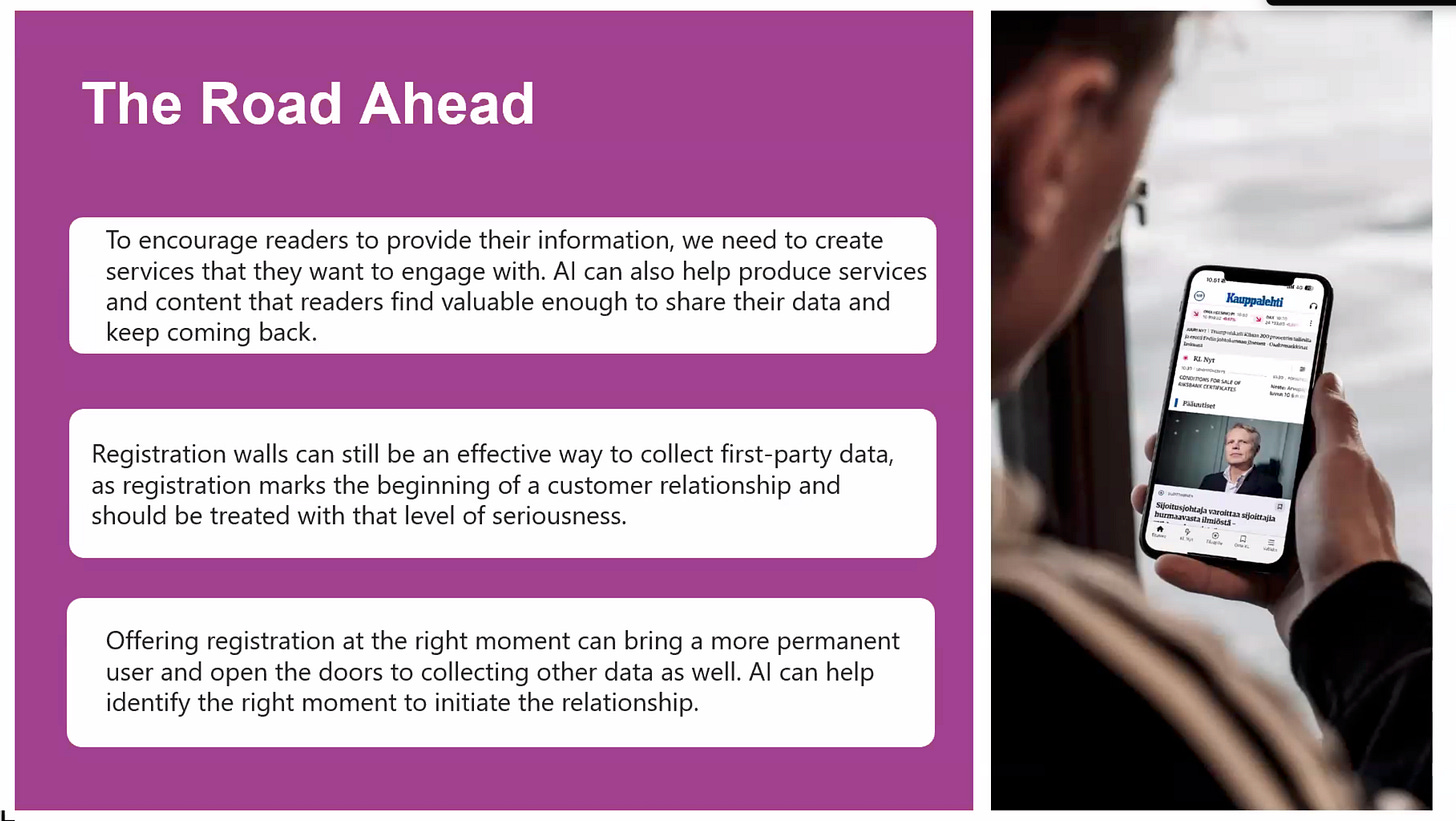 Alma Media pulls first-party data from multiple sources – corporate development initiatives, traditional paywalls, and now the AI chatbot. But Strandholm emphasised that active engagement beats passive consumption.