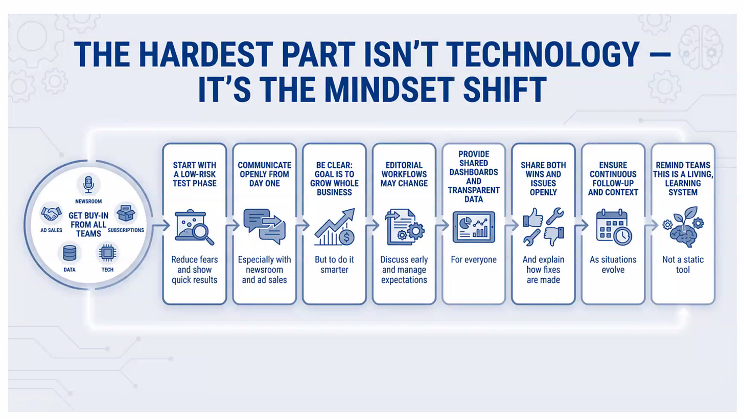 Developing AI tools for first-party data collection takes work. Strandholm acknowledged the challenges of building models that understand both content and audience. Alma Media collaborated with specialists rather than trying to solve everything in-house. Data scientists, product managers, journalists, and commercial teams had to work together to break down traditional silos.