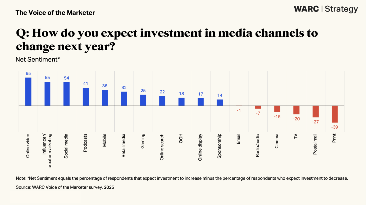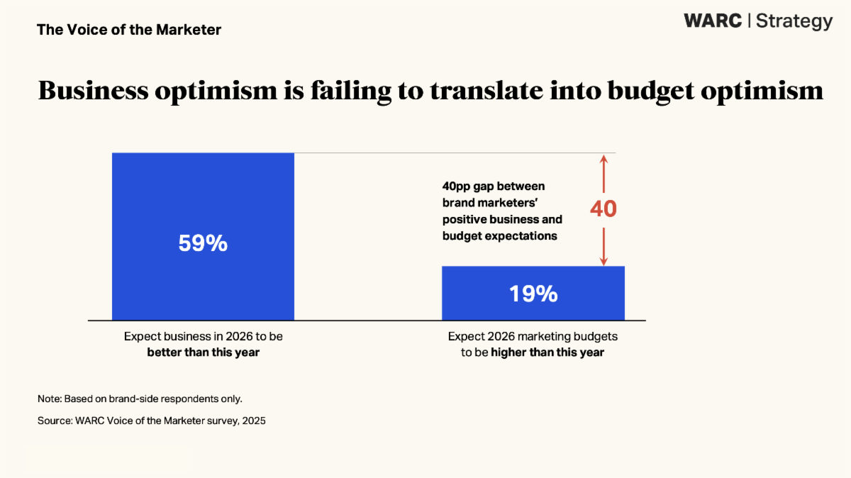 That 40 percentage point gap tells you everything about 2026. WARC’s Voice of the Marketer report surveyed over 1,000 marketers worldwide between September and October 2025. The data shows CFOs aren’t matching marketer optimism with investment.