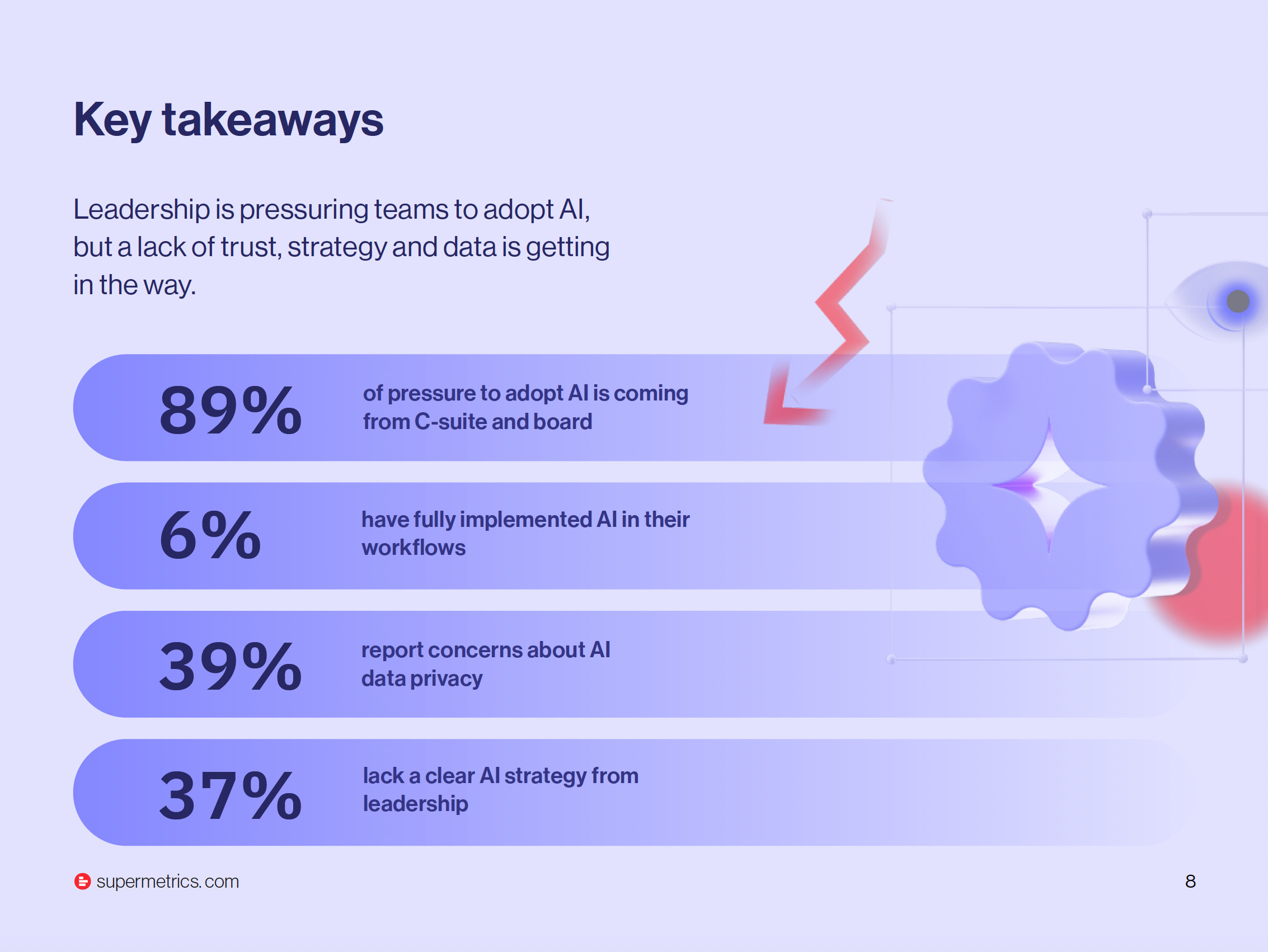 Zach Bricker, North American Solutions Engineering Lead at Supermetrics, is direct about it in the report: “teams are being told to use AI without the support to make it effective. When clear goals are absent, adoption becomes performative rather than functional.”