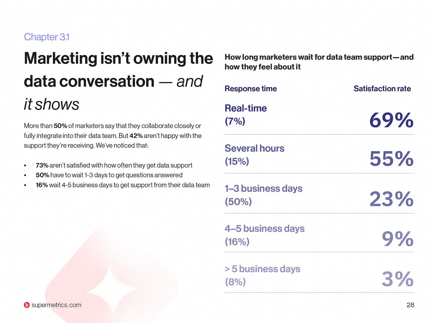 It isn’t reluctance. Most marketers believe AI could help them, 87% say better data and analytics would improve their team’s effectiveness. The real problem is that the data infrastructure required to make AI useful simply isn’t in place. Over a third of respondents report not having access to high-quality, accessible data. A similar proportion cites a lack of system integration between analytics tools and activation platforms. More than half say they wait 1 to 3 business days for answers from their data teams, and 73% are unhappy with the frequency of that support.