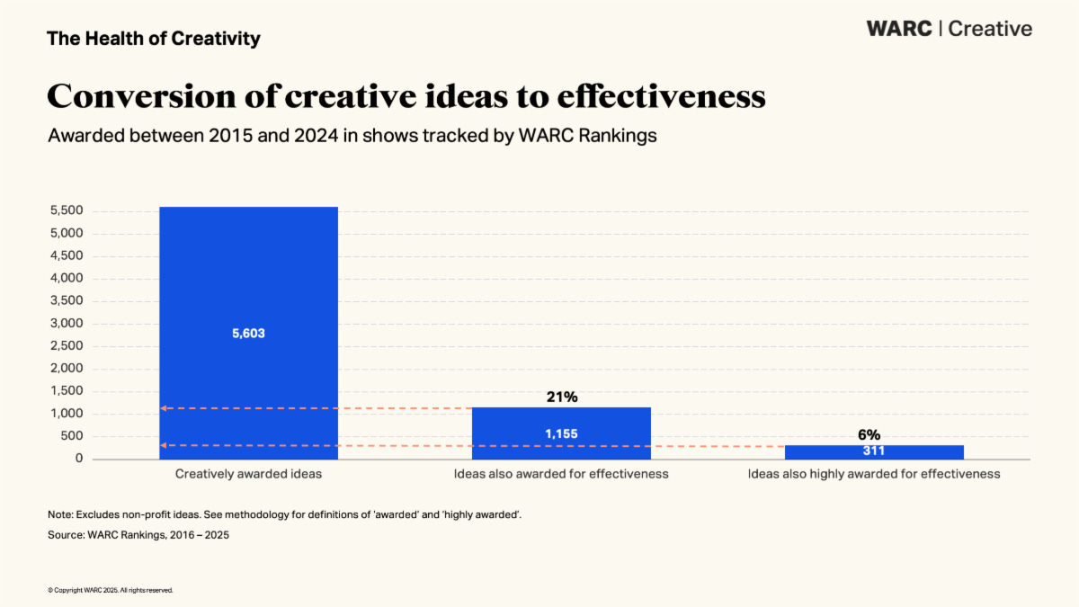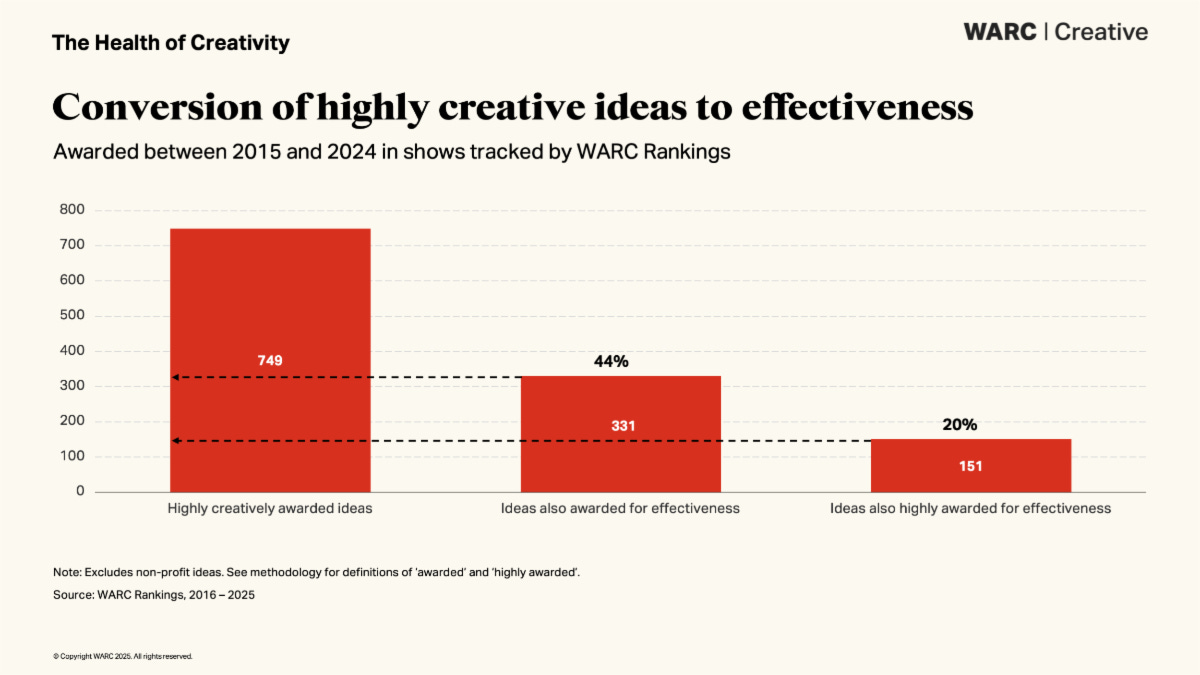 The research, analysing results from major regional and global award programmes tracked through WARC’s annual rankings, reveals something curious. For the very best creative work—campaigns that reach the WARC Creative 100—conversion to effectiveness awards more than doubles to 44%. Get your creative idea to the top tier, and you’ve got nearly even odds of proving it worked.