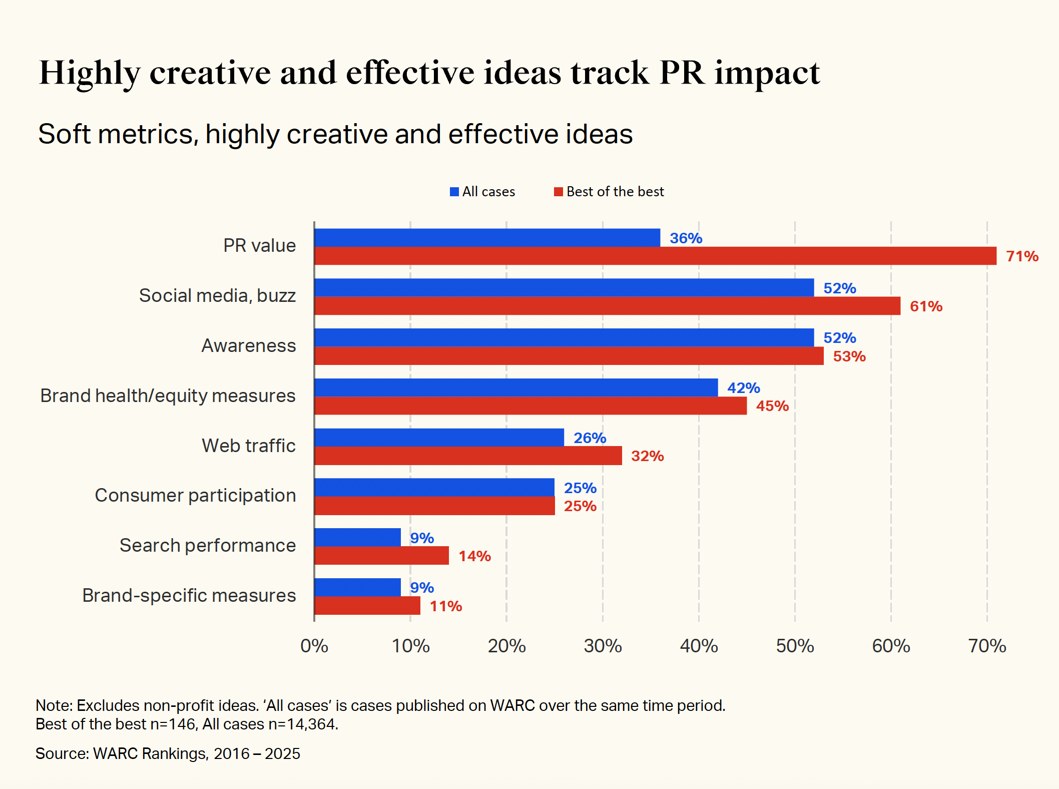 The most successful campaigns overwhelmingly prioritise earned media. PR value was measured by 71% of highly creative and highly effective ideas—nearly double the 36% across all cases. Consider DEGIRO and UN Women’s “Pink Chip” campaign, which created a fictional stock to highlight gender investment gaps. The idea generated global press coverage, demonstrating how campaigns designed for conversation, not just consumption, achieve disproportionate impact.
