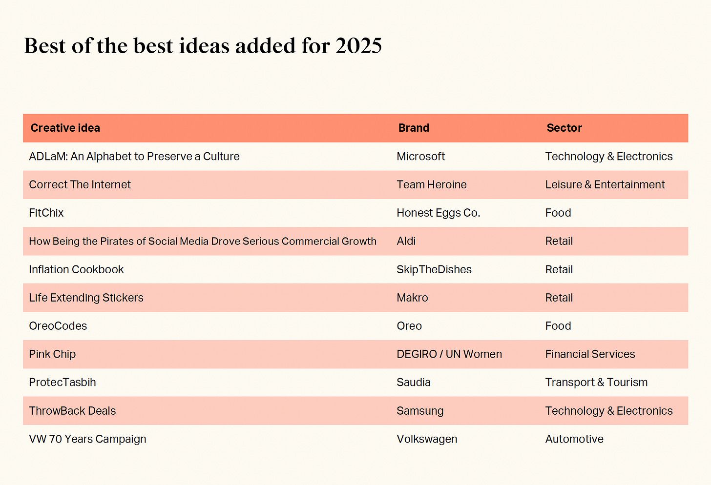 The 151 campaigns that achieved both creative excellence and effectiveness over the past decade prove the possibility. Microsoft’s ADLaM campaign, which created a digital alphabet to preserve the Fulani language, topped the 2025 Effective 100 and reached number 17 in the Creative 100. Honest Eggs Co.’s FitChix, featuring body-positive chickens, converted creative recognition into proven commercial results. Volkswagen’s 70th anniversary work demonstrated how heritage brands can make creativity work commercially.