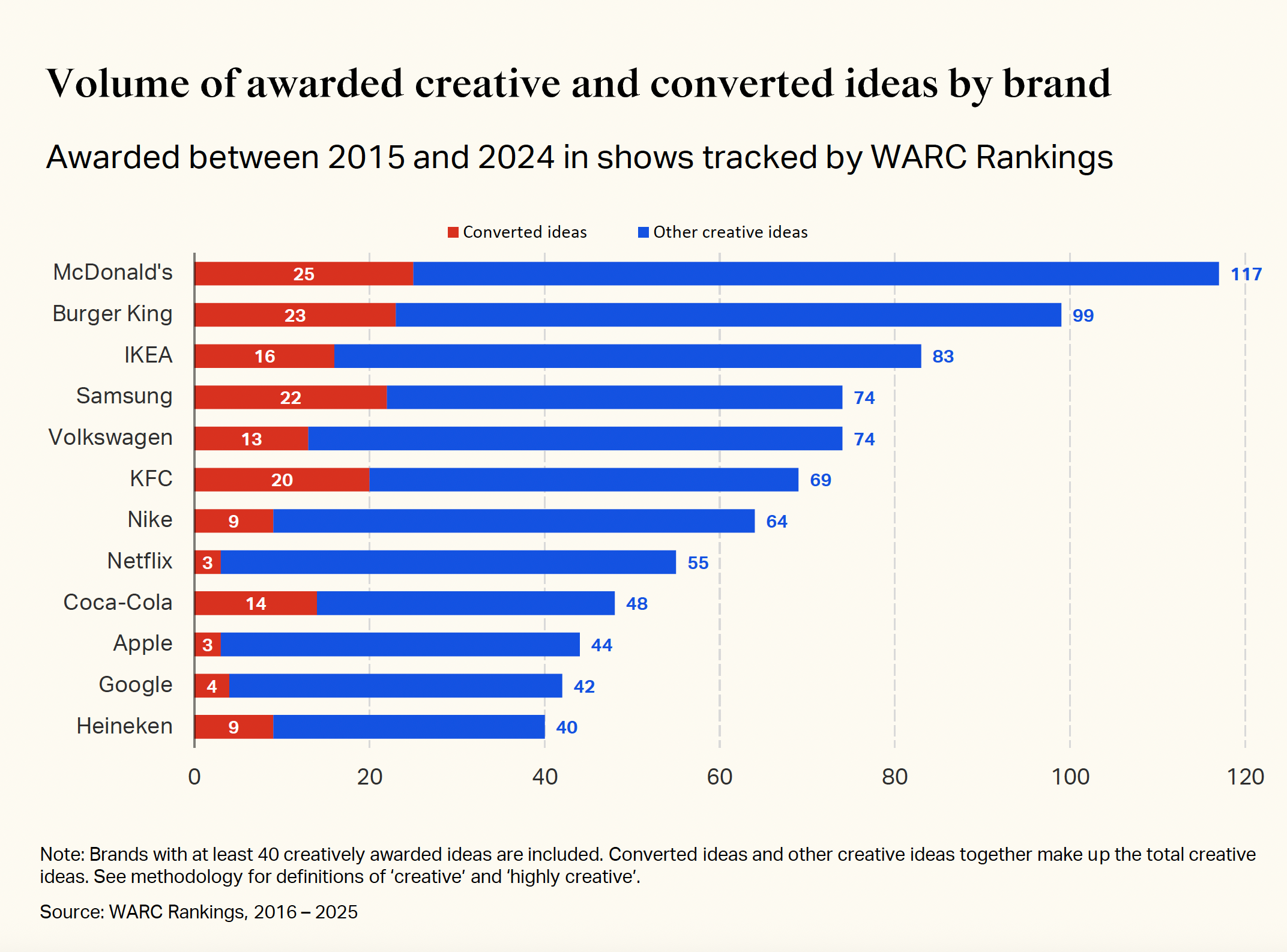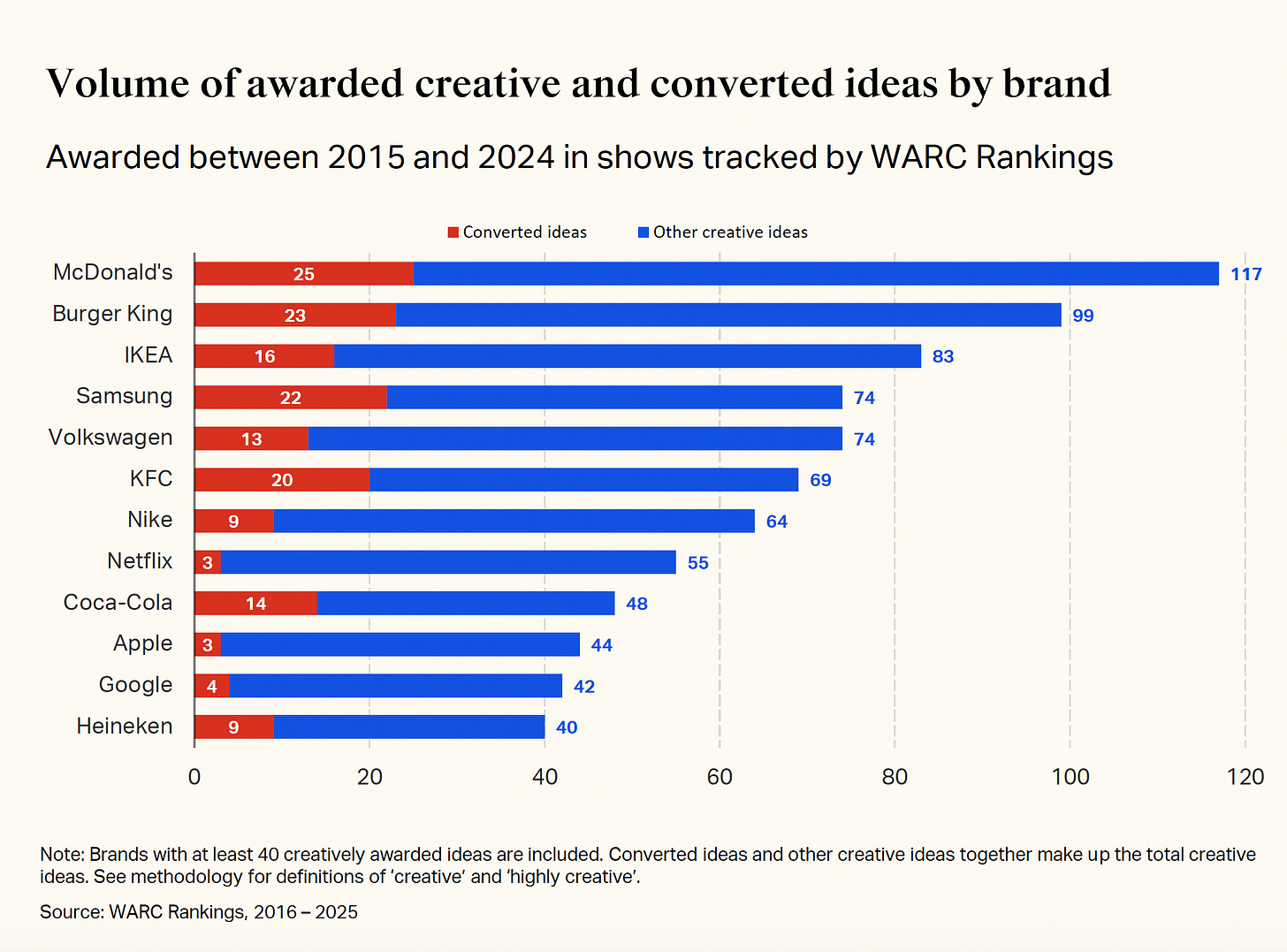 McDonald’s has won more creative awards than any other brand over the past decade—117 campaigns recognised for their ingenuity. Yet when it comes to proving those creative ideas actually worked, the world’s largest restaurant chain converts just 21% to effectiveness awards, underperforming its own retail sector. Its arch-rival Burger King, with fewer creative wins overall, converts half of its best work to proven commercial success.