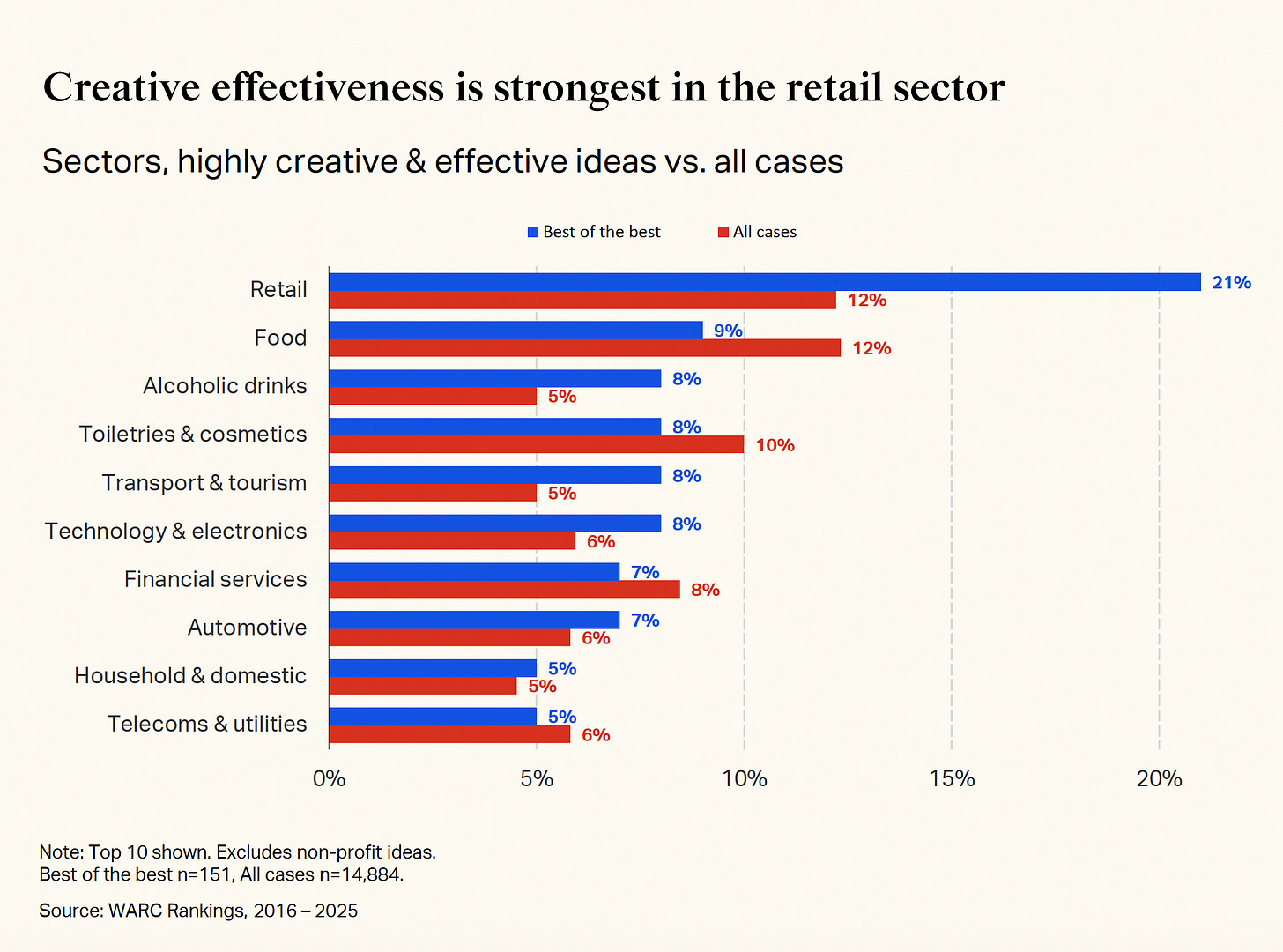 Retail punches above its weight, contributing 21% of highly creative and highly effective campaigns whilst representing just 12% of all cases. Quick-service restaurants lead the charge—Burger King contributes five best-of-the-best campaigns, KFC three.