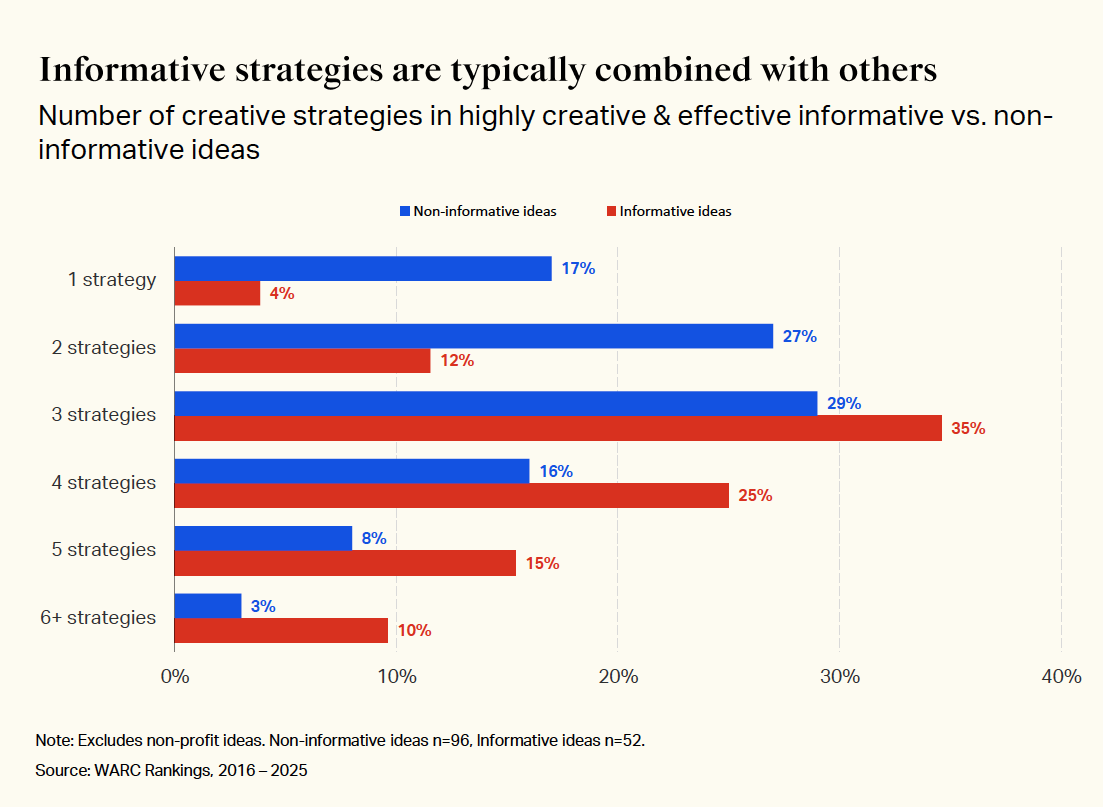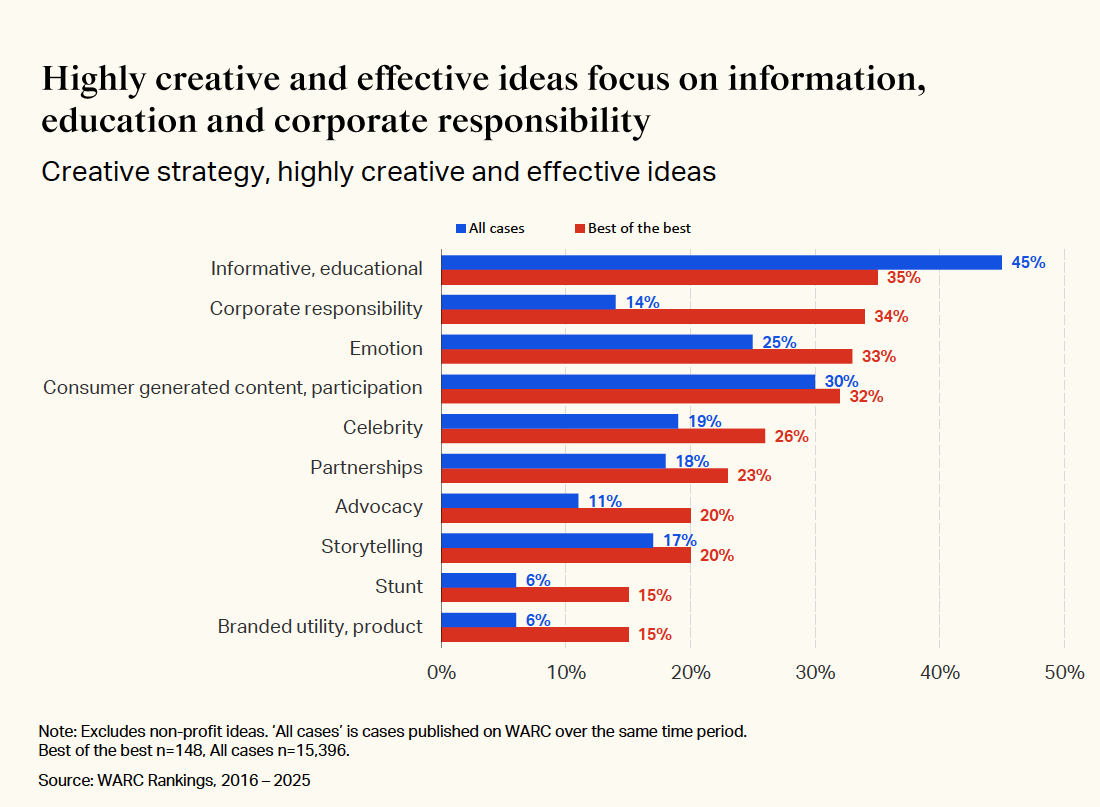 But strategy matters more. The best campaigns layer multiple approaches. Corporate responsibility features in 34% of top campaigns versus 14% of typical work. Emotional strategies appear in 33%. Here’s what’s revealing: whilst 35% of top campaigns include informative messaging, only 4% rely on it alone. The winners balance rational content with fame-building creativity.