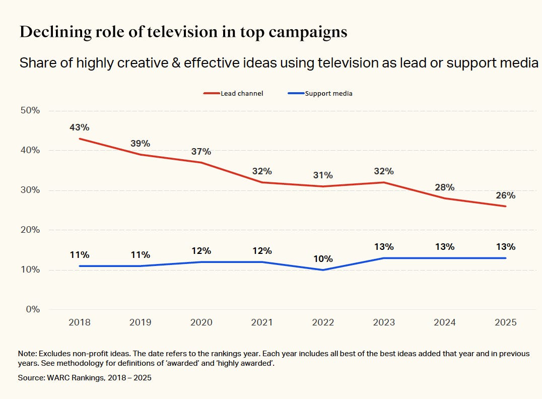 Perhaps the most dramatic shift concerns media. Television’s role as the lead channel has collapsed from 43% of the most creative and effective ideas in 2018 to just 26% today. Of the 11 new best-of-the-best entries this year, only two included television. Neither led with it.