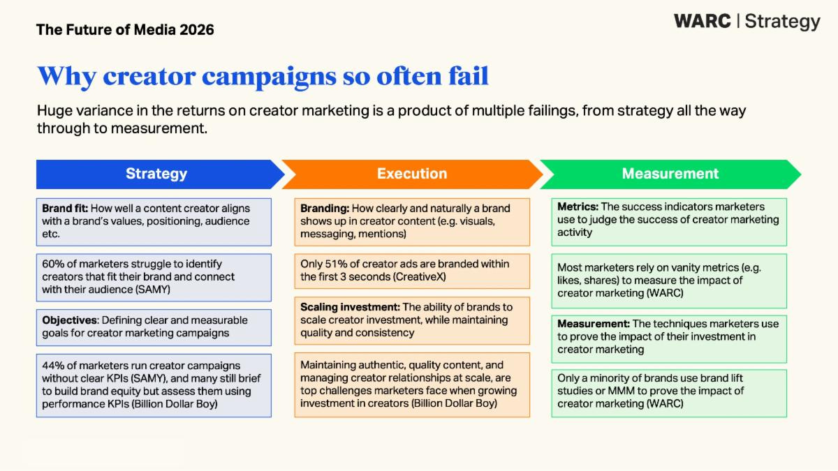 In practice, most marketing teams lack the processes to do this well. They’re used to briefing agencies, not managing creator relationships. They’re used to reach and frequency, not engagement quality and audience loyalty.
