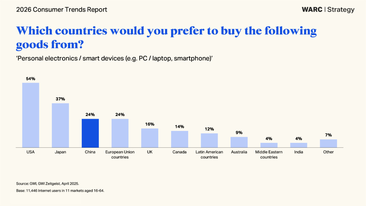 China’s brand shift. 36% of consumers now describe Chinese apps and tech as innovative. One in four globally prefer to buy personal electronics from Chinese brands, behind only the US and Japan. The “Made in China” association has moved from commodity to credibility across a substantial portion of the global consumer base. Western brands competing in consumer electronics and lifestyle tech are facing a different competitive landscape than they were five years ago.