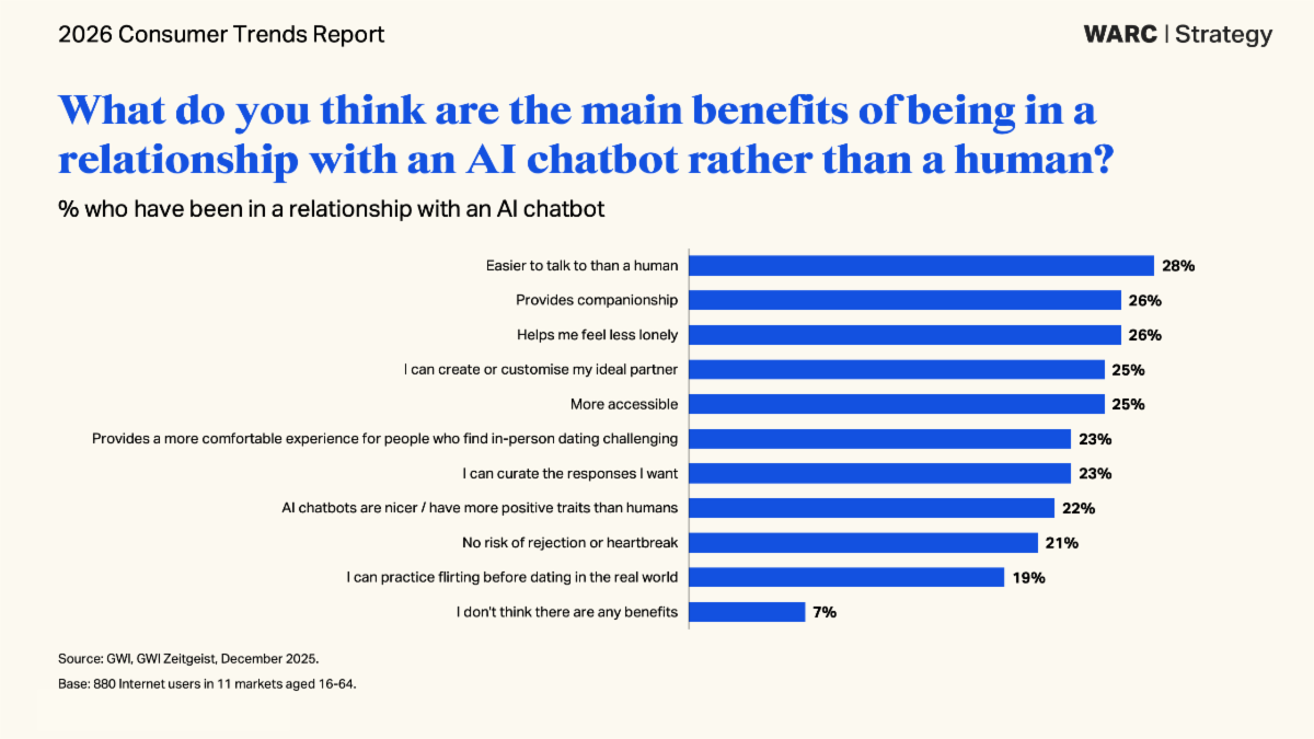 WARC's 2026 Consumer Trends: One in Ten People Are in a Relationship with an AI